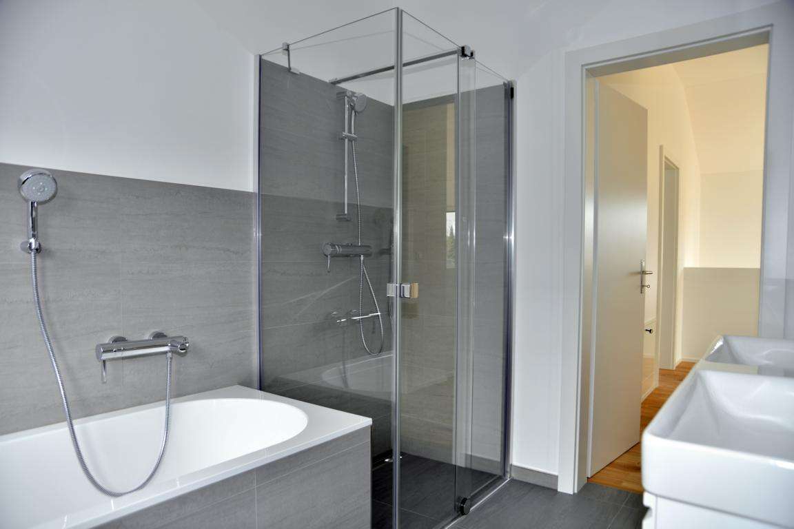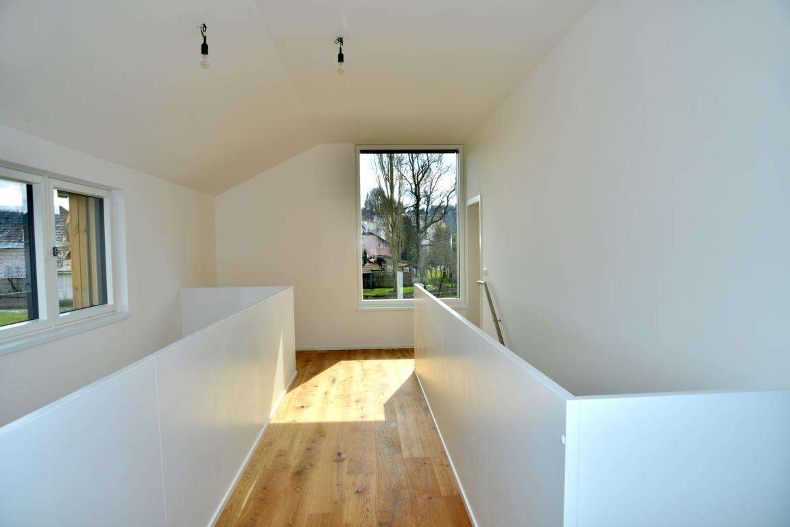 Durch die offene Treppe gelangen Sie in das Obergeschoss, wo Sie grosses Fenster mit Aussicht ins Grüne erwartet. Vier Schlafräume und das schöne Badezimmer mit wunderschöner Ausstattung runden das Geschoss ab.